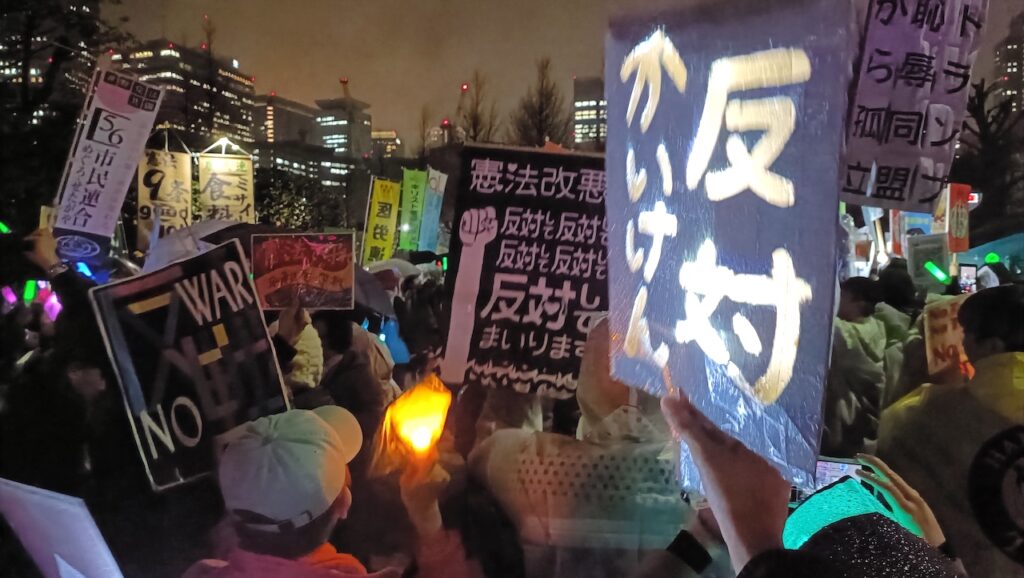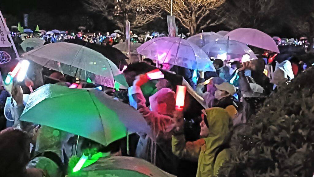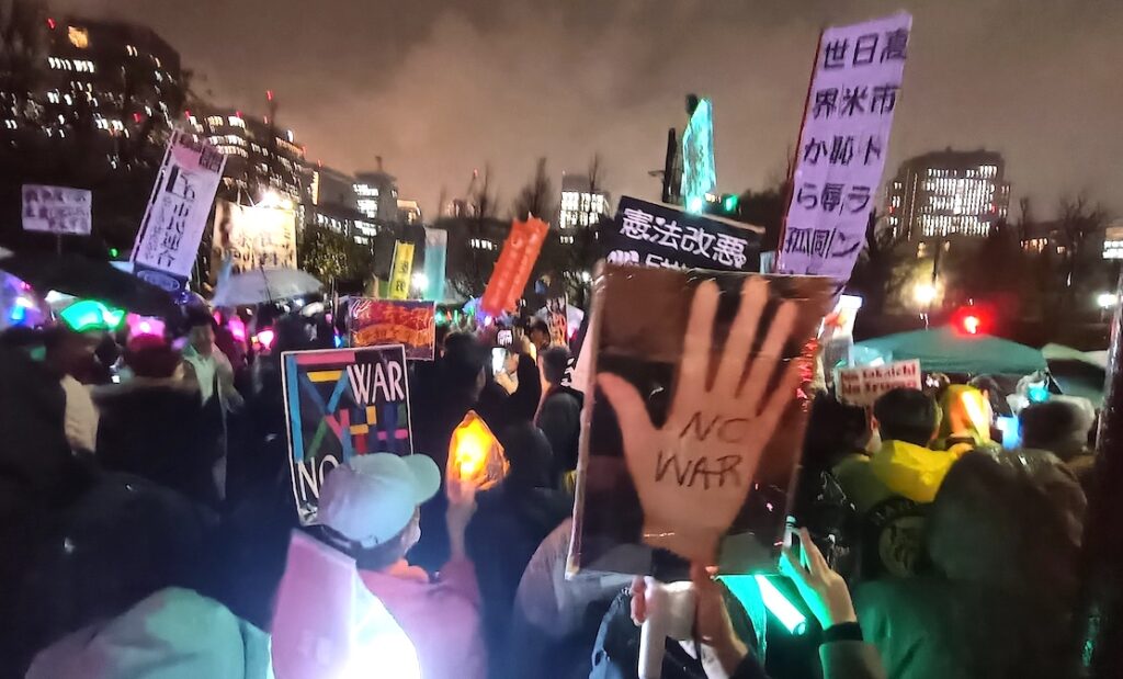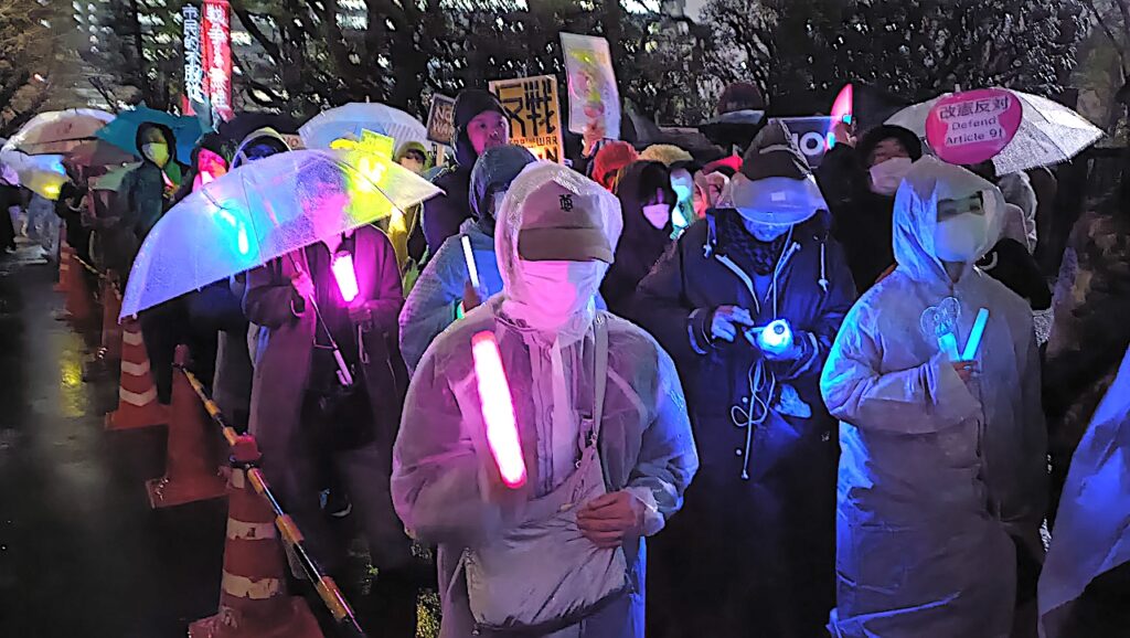議事堂一帯はペンライトやプラカードの「光もの」を手にする人びとでぎっしり埋まった。「戦争反対、改憲反対、9条守れ」のシュプレヒコールが鳴り響く。最後に主催者から「参加人数は2万4千人、ライブ視聴数は6万人」と発表されるとどよめきが広がった。