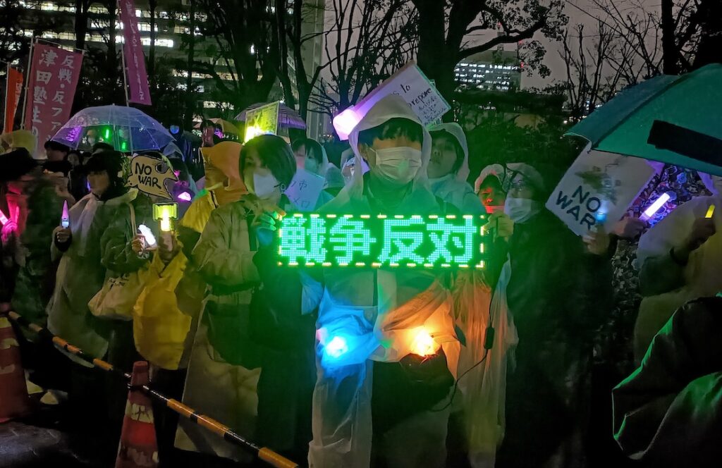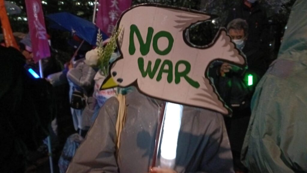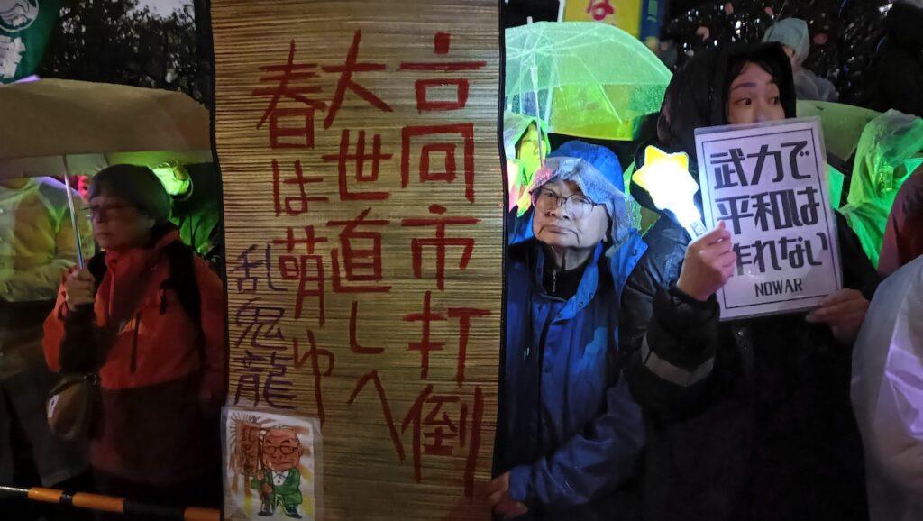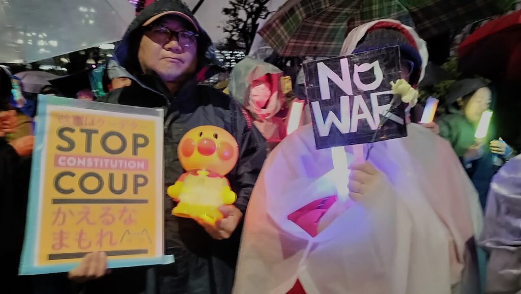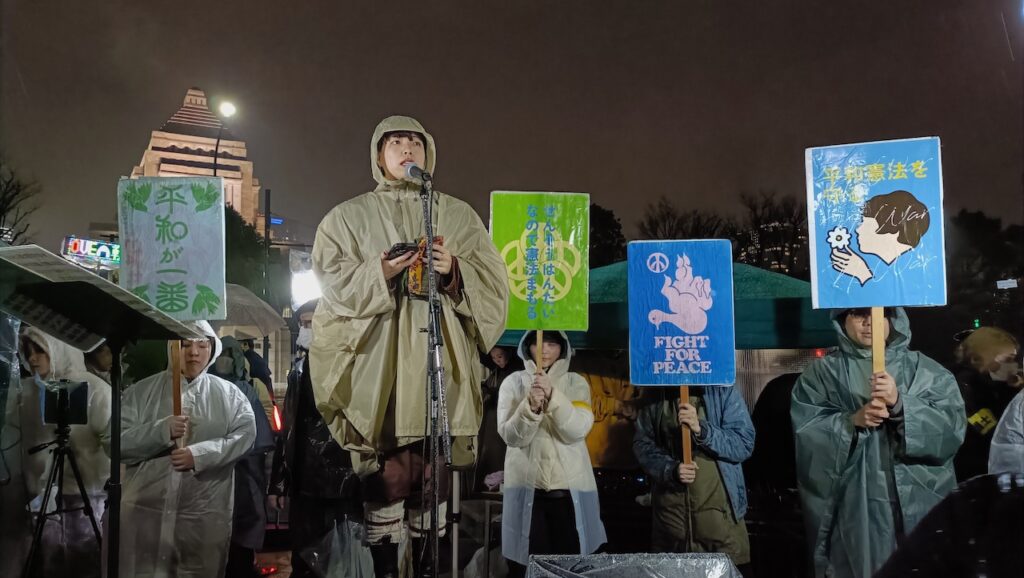 3月25日の国会正門前「平和憲法を守るための緊急アクション」は雨にもかかわらず、大結集となった。イラン戦争加担にのめり込む高市政権に対する危機感だった。菱山南帆子さんは、「憲法9条は被害だけでなく加害の歴史も繰り返さないという世界に向けた誓い。戦争の道に歩もうとする高市日本を止めるために、憲法9条を活かす時だ。民衆・市民の力を信じて『光の革命』を起こしましょう」と訴えた。