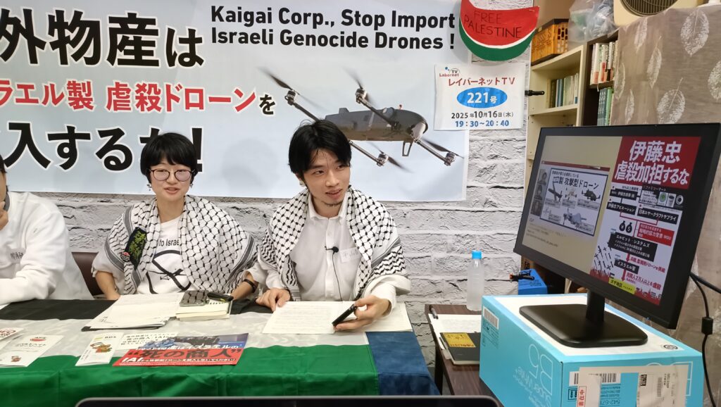 スタジオの背景に飾られた大きなバナーには、「海外物産はイスラエル製虐殺ドローンを輸入をするな!」と書いてあった。聞き慣れない会社の「海外物産」だが、じつは武器取引企業としては一番悪質で、「一円入札」までして仕事をとろうとしている。「海外物産」がいまガザ虐殺支援をやめさせる一番のターゲットだ。じつは昨年、署名運動をはじめさまざまなキャンペーンを展開して、イスラエル最大の軍需企業であるエルビット・システムズとの契約を「伊藤忠」にやめさせたという成果も上げている。こうした運動をマスコミはほとんど無視しているが、若い世代の粘り強い「パレスチナ連帯」のたたかいは着実に前進している。ぜひ番組をみて広げてほしい。(レイバーネットTVプロジェクト)