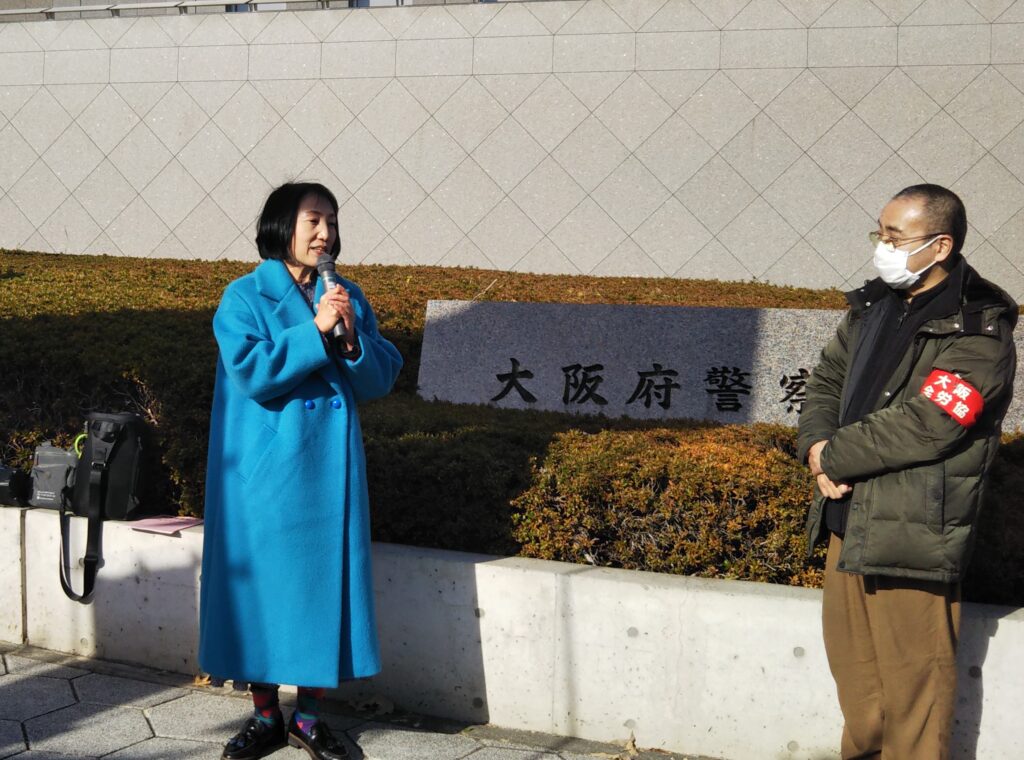 「労組つぶしの大弾圧を許さない実行委員会」主催の元旦行動は、産別労組や地域労組、基地や原発に反対する市民団体、外国人等の人権を守るために闘う団体などの450人の仲間が大阪府警本部前に結集しました。