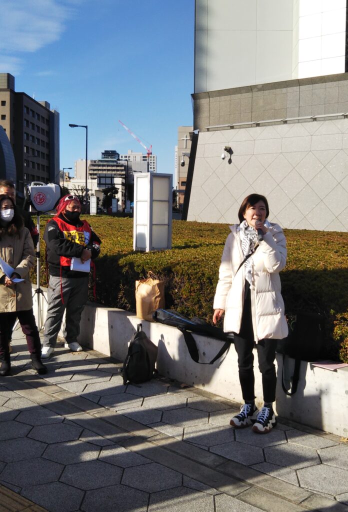 毎年この元旦行動に参加しているれいわ新選組の大石あきこ衆議院議員は警察・検察が取り調べで「関生を削る」と発言しているがこれが弾圧の本質だとしました。維新と「悪魔合体」した高市政権に対して、憲法審査会の委員となった自分はこれからも執拗に闘っていくと決意を語りました。
