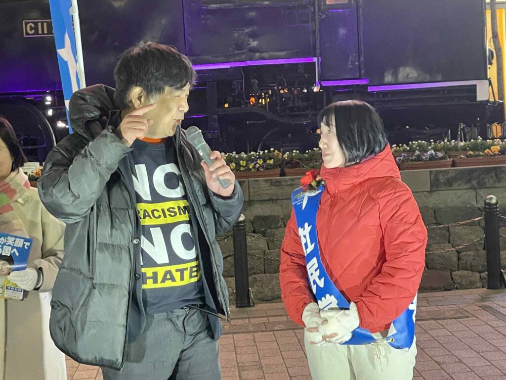 ●19時には新橋駅SL広場に移動しての街宣にも参加させて頂いた。スピーチでなく大椿さんとのトークにさせて頂いた。「大椿さんは首を切られた非正規労働者、いわゆる当事者だ。ボロボロ状態の貧困格差、人々は分断された。現役世代の手取りを増やす名目で、社会保障費は削減され高齢者や障がい者は切り捨てられる。当事者が声をあげ立ち上がるためにも大椿さんのような当事者が国会に戻り、当事者運動の希望となるべきだ。」