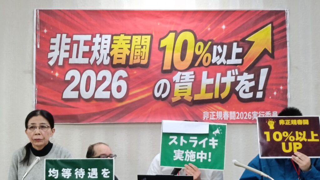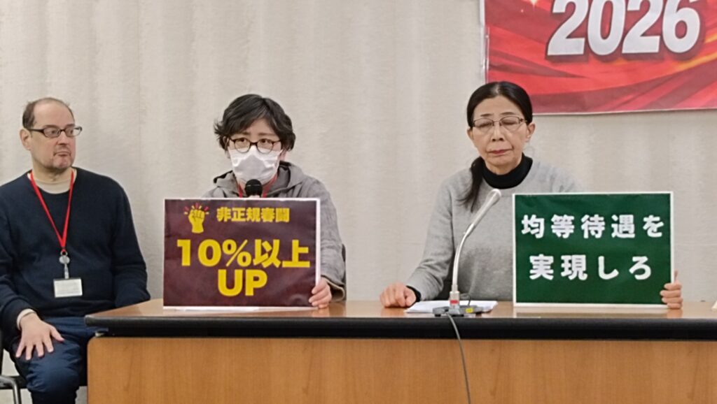 会見では、非正規当事者たちが次々にマイクを握り、実態とたたかいを報告した。また会見場の大きなスクリーンが通じて、オンラインで仙台・名古屋・大阪・沖縄のユニオンからのレポートがあった。仙台のけやきユニオンでは、学費が払えないでヤマトで働いている留学生とスキマバイトの日本人が一緒になって、ヤマト運輸に対して25%の賃上げを申しいれたとの話があった。名古屋ふれあいユニオンでも自動車部品をつくっている日系ブラジル人の話が出たが、非正規問題は外国人労働者問題とも強くつながっていた。