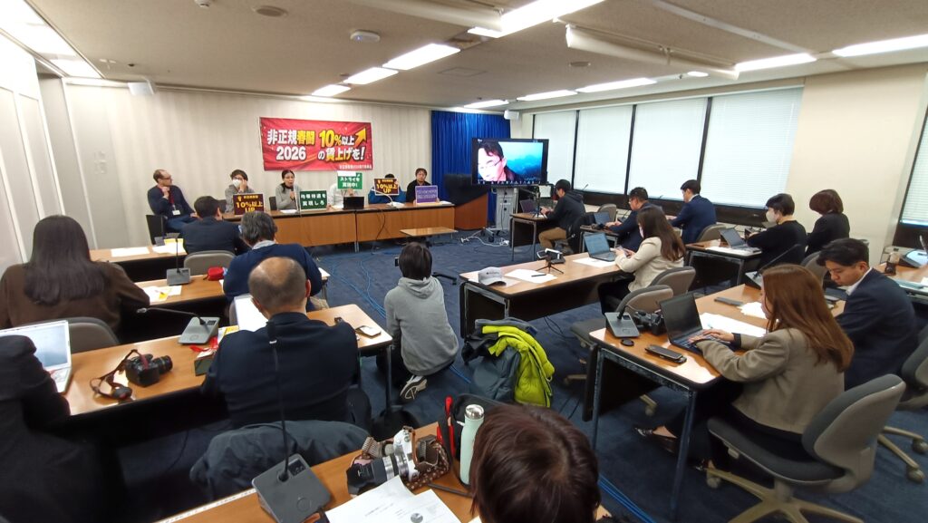 2月2日午後の厚労省会見室は、30人近くの記者と関係者でごったがえしていた。この日行われたのは「非正規春闘」実行委員会の会見だった。「働いているのに生活の見通しが立たない。物価高で限界。連合は7%の賃上げと言っているが、それでは全く追いつかない。私たちは10%以上の賃上げを要求する」と尾林哲矢さん(首都圏青年ユニオン)は力をこめた。