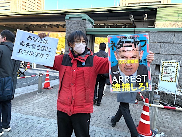 「イスラエル製ドローン輸入は虐殺支援」のプラカードを掲げながら私が続ける。