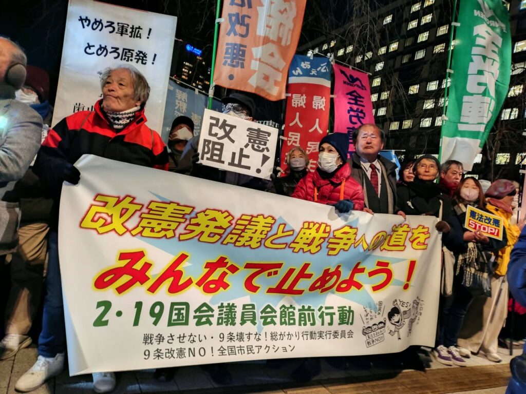 冷たい風が吹く2月19日夜、総がかり行動実行委員会らが主催し、「改憲発議と戦争への道をみんなで止めよう!2・19国会議員会館前行動」が行われ、1000人が参加した。インターネットで集会を知った初参加の若い女性たち30名ほどもいた。
