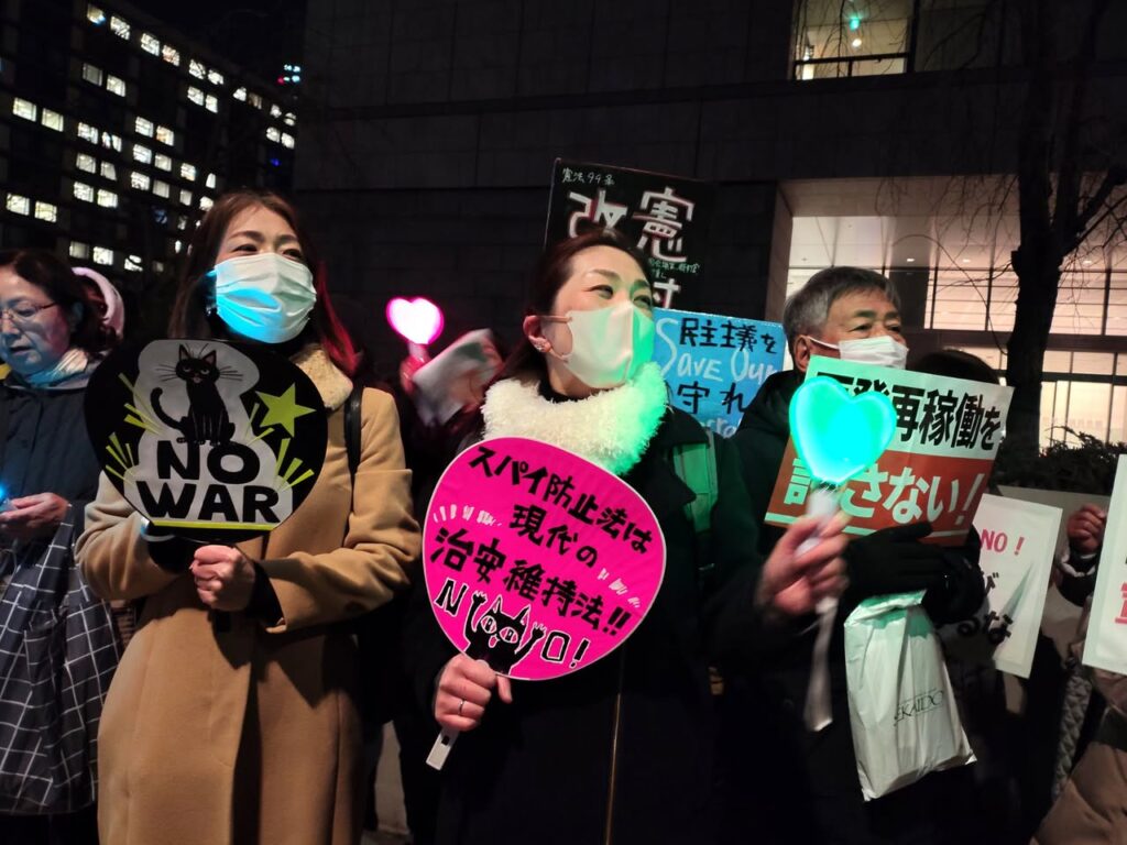 前日18日に特別国会が開会し、自民党圧勝を受け第2次高市政権が発足した翌日の19日行動となった。高市首相は衆院で自民単独で改憲発議に必要な2/3の議席を得たことを背景に、早速憲法改悪のための「改憲発議」を最大の課題として「戦争国家づくり」を企んでいる。維新はその「アクセル役」になると言い、国民民主・参政など改憲賛成派が圧倒的多数を占め、国会が大成翼賛会化している。更に、高市政権は国民総監視・現代の治安維持法であるスパイ防止法案の早期成立を狙っている。