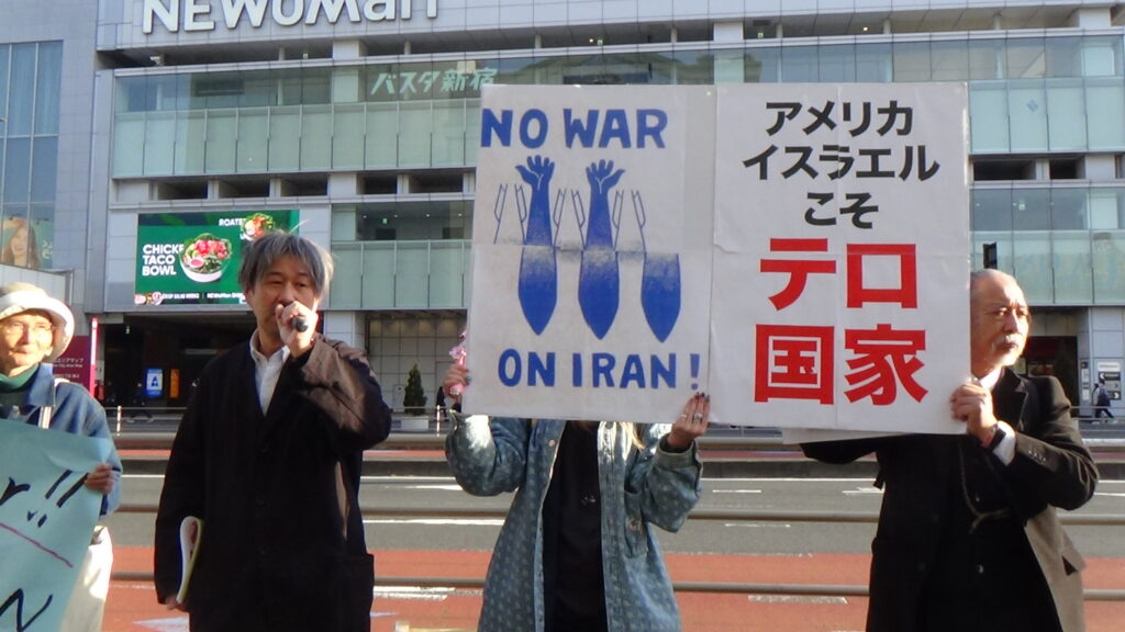 3月1日午後、東京・新宿南口の路上で「アメリカとイスラエルによるイラン攻撃」に抗議するスタンディングが行われた。緊急の個人の呼びかけにもかかわらず、プラカードをもった人たちが150人近く集まった。「アメリカ イスラエルこそテロ国家」の文字がひときわ目を引く。同じ時間帯にメディアでは「イランの女子小学校に空爆で児童100人以上が死亡か」のニュースが駆け巡っていた。「ひどすぎる」「こんなムチャクチャなやり方を絶対に許さない」人びとの怒りは大きかった。世界は無法地帯に化したのか。どうしたら止められるのか、やり場のない怒りが広がる。でもなんとかしなくては。