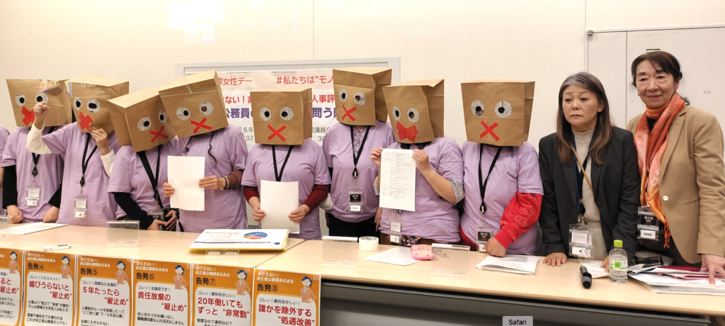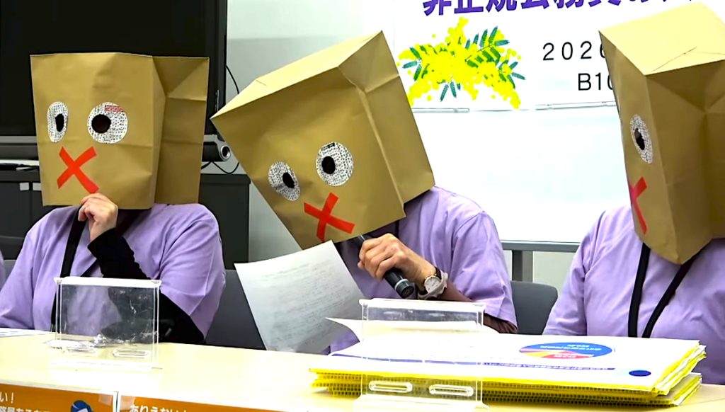 非正規公務員については「気楽で時給が高い」とされることも少なくありません。ただ、「1年だけの公務員」と法律に書かれ、仕事はずっとあるのに任用を打ち切ってはまた任用し直すという超不安定な働かせられ方の中で、異論があってもモノを言えず、今回は、「身バレ」を防いで安心して発言できるよう、苦肉の策として、覆面をかぶって訴えるという試みとなりました。そんな中で、トイレの回数が評価に影響するといった訴えまで集会直前に舞い込むなど、隠れた厳しい実態が改めて明るみに出ました。