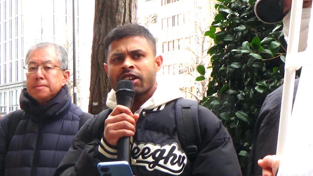 本社前の集会で、ヤマトで働くバングラデシュ出身の留学生(写真左)は、「生活費や学費を賄うために深夜の低賃金労働に従事している。ガス電気家賃が上がり、本当に生活が大変。賃上げをしてほしい」と切実に訴えた。スキマバイトの女性(写真右)も留学生に合流して一緒にたたかっている。彼女は「倉庫の仕事は重い荷物を仕分けするが、山のようにある。ベルトコンベアのスピードに追われてとてもきつい。社員からは荷物を『三秒に一個だ』と急かされる。これで最低賃金ではやってられない」と過酷な現場の実態を語った。また非正規の友人は美容院に行く金がなく髪をハサミで自分で切っていることや、一人暮らしができず実家に帰った話など深刻な実態が広がっていることを紹介した。