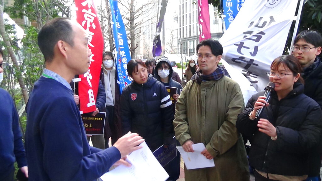 この日は「非正規春闘・統一ストライキ行動日」だった。仙台けやきユニオンは、ヤマトの仕分け倉庫で働く非正規労働者を組織している。25%の賃上げを求めてきたが、会社の回答は「ゼロ回答」であったため、ストライキを実施することになった。この日はその通告書を手渡すために9人が上京した。