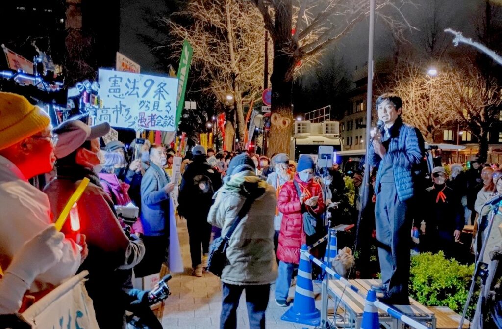主催者挨拶に立ったのは「戦争させない・9条壊すな!総がかり行動実行委員会」の菱山南帆子さん(写真左)。「まずアメリカとイスラエルによるイラン攻撃に断固抗議する。いま日本の米軍基地から海兵隊がイランに出発しているという。日本が出撃拠点のひとつになっていることは、平和憲法をもつ国としてあってはならないことだ。高市訪米でなにを約束されられてくるかわからないが、自衛隊の艦船派遣は絶対に許せない。トランプのとんでもない要求にはきっぱり断れ!」と声を張り上げた。