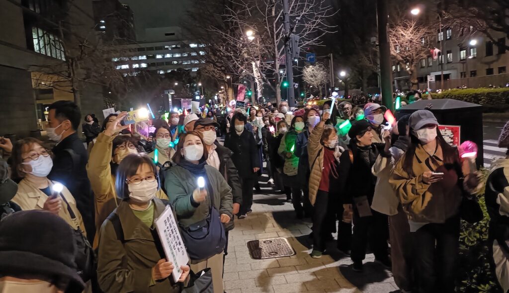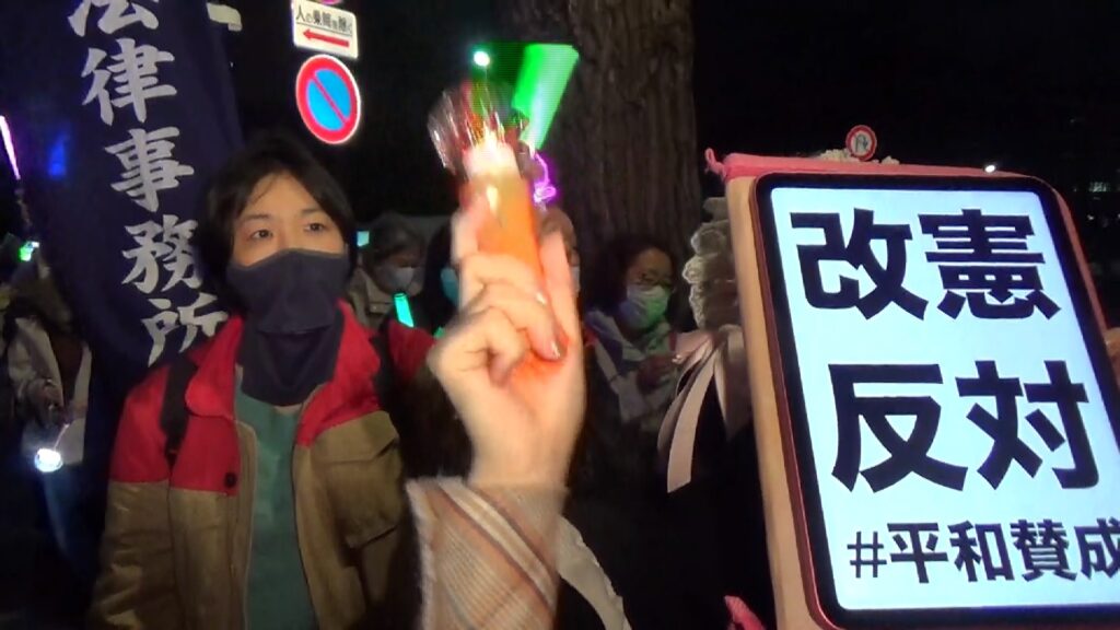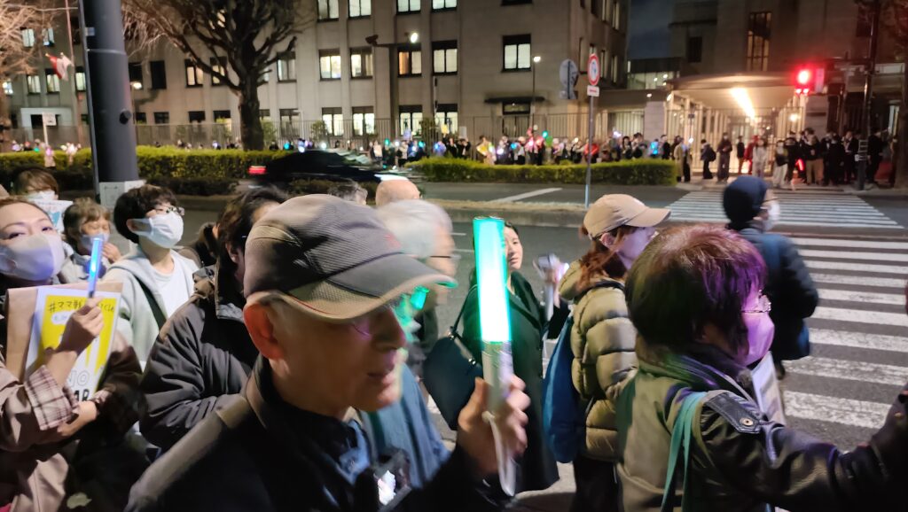 これまではシニア層がほとんどだったが、この日は若者がとても多い。とくに女性がめだった。手に手にペンライトやタブレットをもっている。「改憲反対」「子供を殺した国にNOと言え」「独裁を許すな」、言葉やデザインが多彩だった。頭に光りもののリボンを付けていた20代の二人連れの女性に聞いた。「デモは何回目ですか?」と質問すると「初めてです。一緒の友達は3回目」という。渋谷や新宿の繁華街を歩いているような若い女性が、国会前に来ているのだ。反高市の運動の波は確実に広がっていることを実感した。