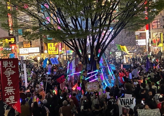 3月29日(日)16時から新宿駅東南口で始まった「高市&トランプに抗議するブロックパーティー」は反戦音楽ライブ。暗くなるにつれて人数が増えていき、ペンライトの輝きが増す。20時10分現在、東南口広場は若い世代に埋め尽くされ、2階デッキと新宿駅改札口に向かう階段もプラカードと横断幕が占拠。音楽に乗せた「戦争反対!」「高市やめろ!」の大合唱が新宿繁華街に轟きわたる。まだまだ終わりそうにない。・・続報準備中。