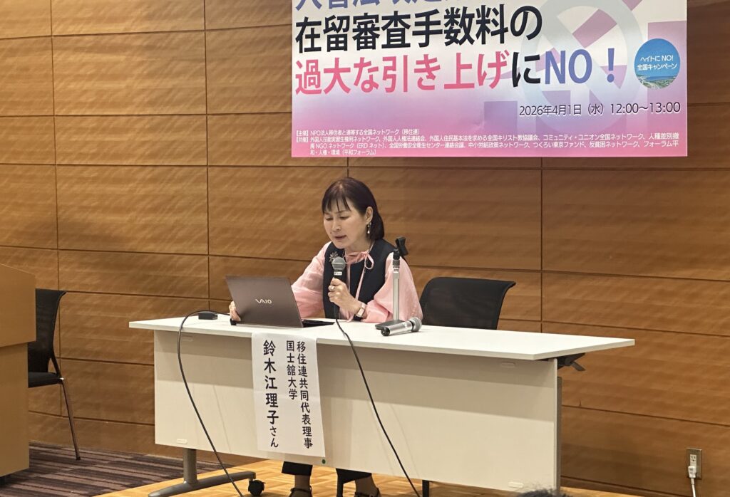 現行法では在留審査に係る手数料の上限は1万円だが、改定案は上限を在留資格の変更や在留期間の更新については10万円、永住許可については30万円まで引き上げる内容になっている。具体的な手数料額は政令に委任され、改正された法律や政令は2027年3月末までに施行するとされている。集会はNPO法人「移住者と連帯する全国ネットワーク」(移住連)が主催し、外国人の支援活動などに取り組んでいる10団体が共催した。オンラインを含めて約220人が参加した。