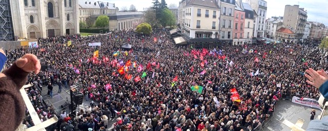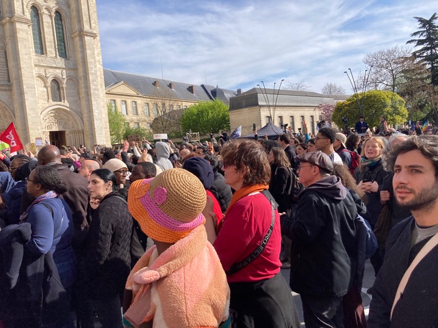 バガヨコ市長はひどい差別発言を流した極右系24時間テレビ放送C NEWS を訴え、4月4日にサン=ドニ市庁舎前でレイシズムと全ての差別に反対する集会を呼びかけた。40の団体が賛同し、市庁舎とフランスの歴代の王の墓があるカテドラル前の広場とそこに続く道は当日、ものすごい数(ゆうに1万人以上)の人々で埋められた。大勢のサン・ドニ市民に加え、パリや近郊、ルーべなどからも人々は集まった(私たちパリから行った人はメトロ13号線の停電のせいで、途中から郊外急行に乗り換えたり、徒歩で赴いた)。レイシズムにノンを突きつけ、多くの移民系市長と市議の当選を喜び、「新しいフランス」の存在を誇らかに示したのだ。大勢の若者たちは市議や市民のスピーチに拍手、コール、歓声で応え、「私たちはみんな反ファシストだ」というイタリア語のスローガンを一緒に叫んだ。