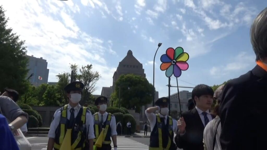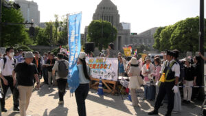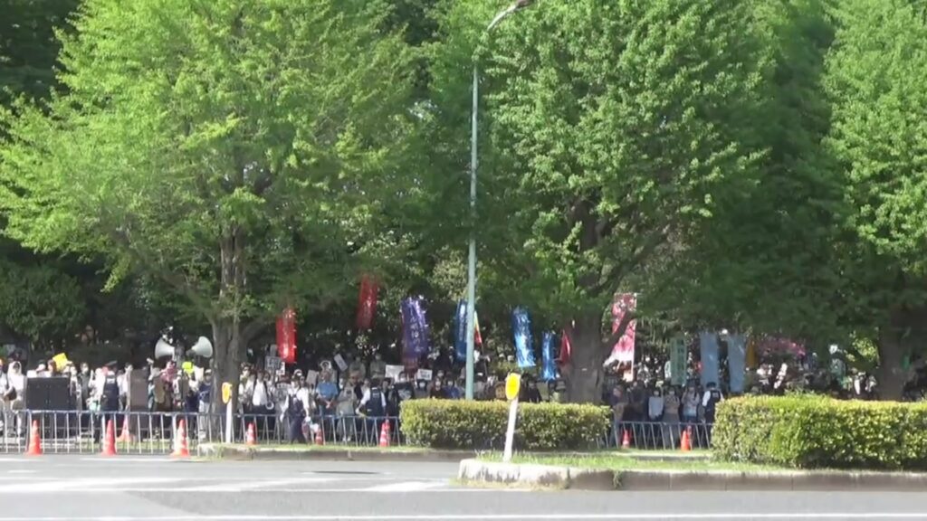 4月19日13時半。日曜だというのに、国会議事堂前駅でゾロゾロ人が降りてゆく。駅構内のトイレは大行列。これから国会デモに行くのだ。階段を上がると、警察官が道案内をしていた。