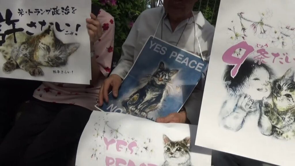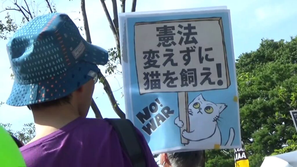 夜ではないのでペンライトでなくプラカード。思い思いに趣向を凝らし、ユニークなものが多かった。何故か猫のイラストが目立つ。今や鳩より猫の方が平和との相性がいいのかな?