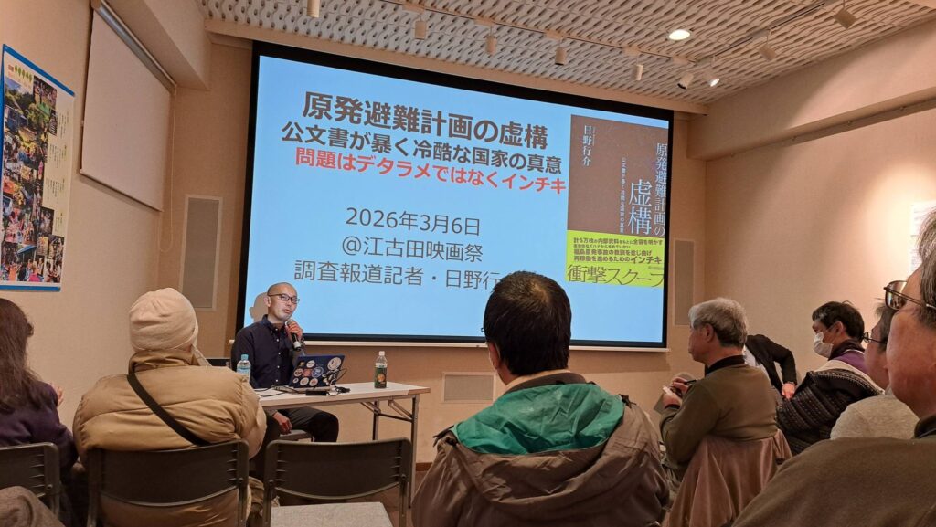 3月6日、ギャラリー古藤で開催されている江古田映画祭で、調査報道記者・日野行介さんの講演が行われた。題して「原発再稼働のための避難計画のインチキ」。避難計画は住民のためのものではなく、はじめから実効性などないことを、五万枚の内部資料から明らかにした。