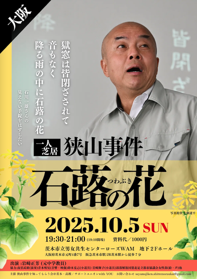 イラン侵攻が始まった2月28日(土)夕刻。北区にある銀河実験劇場で、狭山事件をテーマにした一人芝居『石蕗(つわぶき)の花ー石川一雄・短歌に託して』(右下=大阪公演のチラシ)を見る。目の前の舞台は獄中。そこに立つ石川一雄さん(演者・岩崎正芳さん)・・朝の独房に靴音が近づく。聞き耳を立てる。その音が自分の房の前に止まれば死刑執行である。